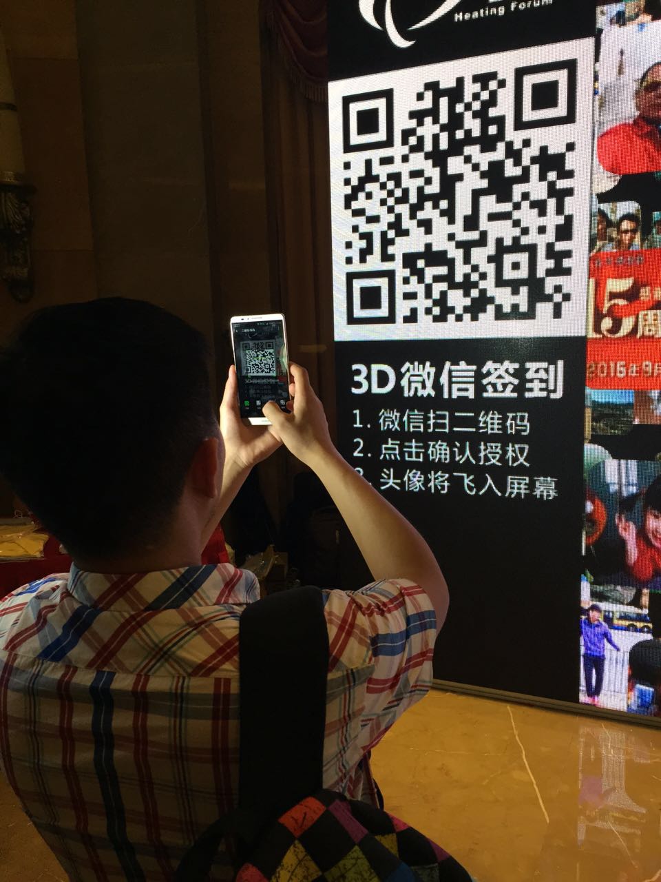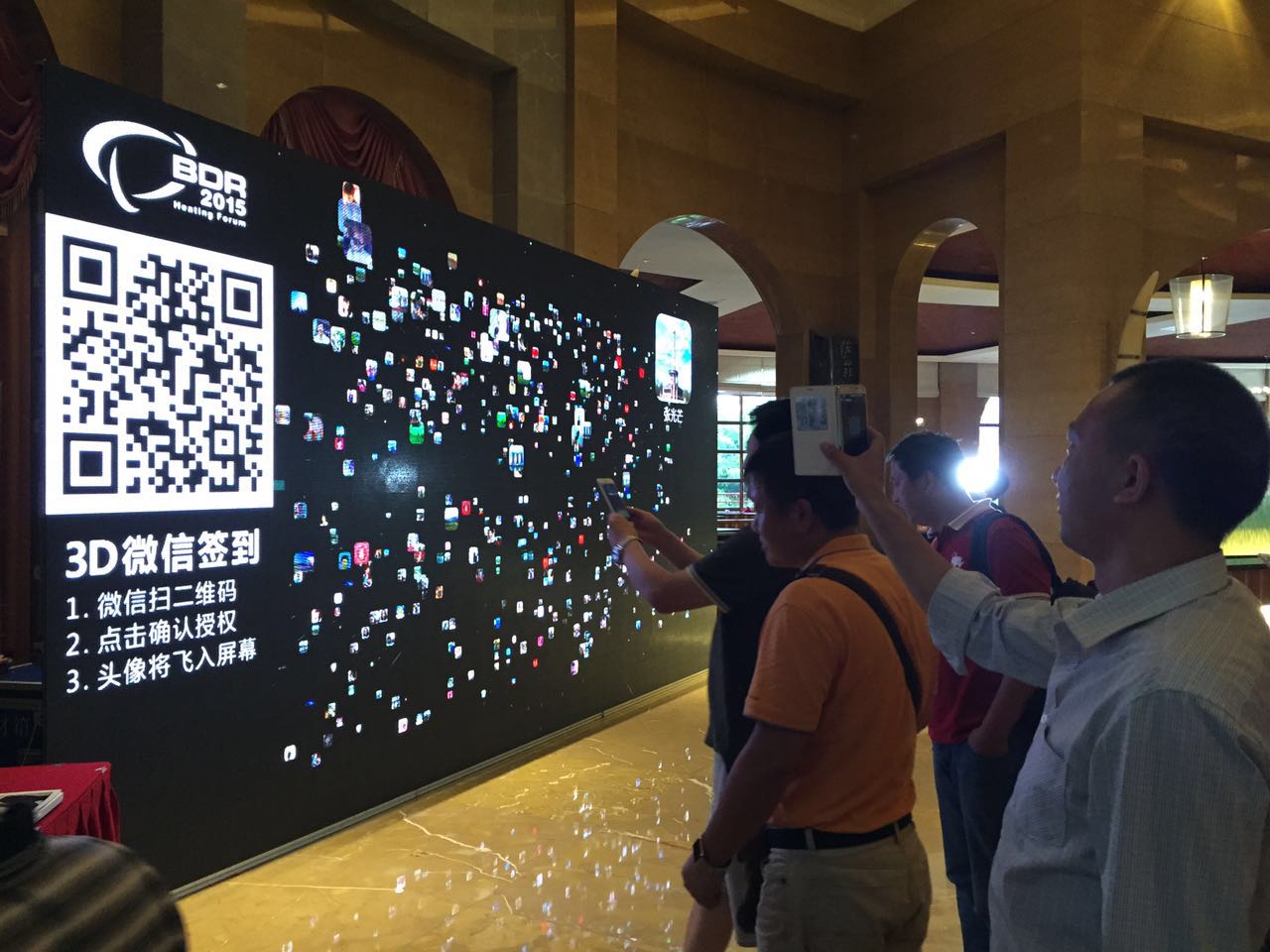 首 页 公司业务 新闻中心 案例展示 企业文化 玖月•视觉 联系我们“3D微信签到”是现今最流行的签到产品,活动来宾通过微信扫描二维码,实现签到,微信头像实时展现在大屏幕,并动态组成活动logo、企业名称或企业口号等字样。“3D微信签到”,作为现场互动的焦点,不仅能使活动来宾获得强烈的参与感和自我展示的机会,而且能让企业的微信账号获得大量关注,为企业的微信营销做好铺垫。
